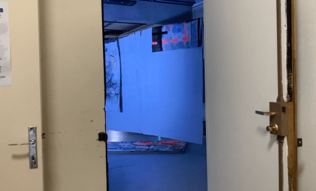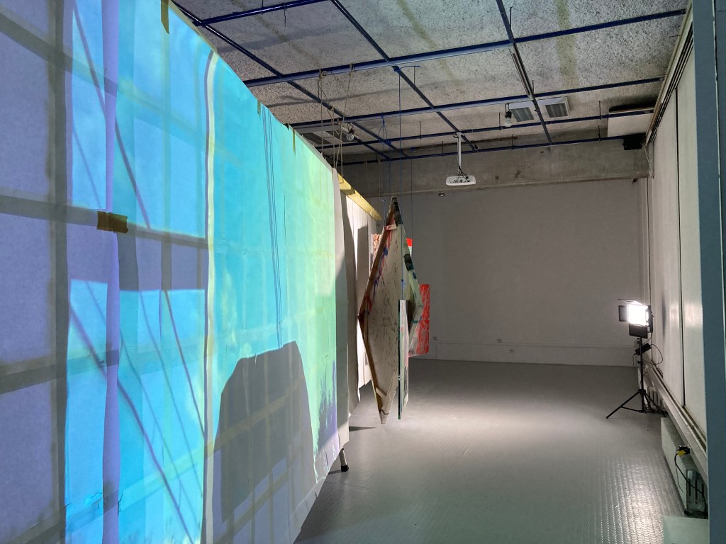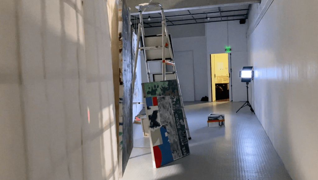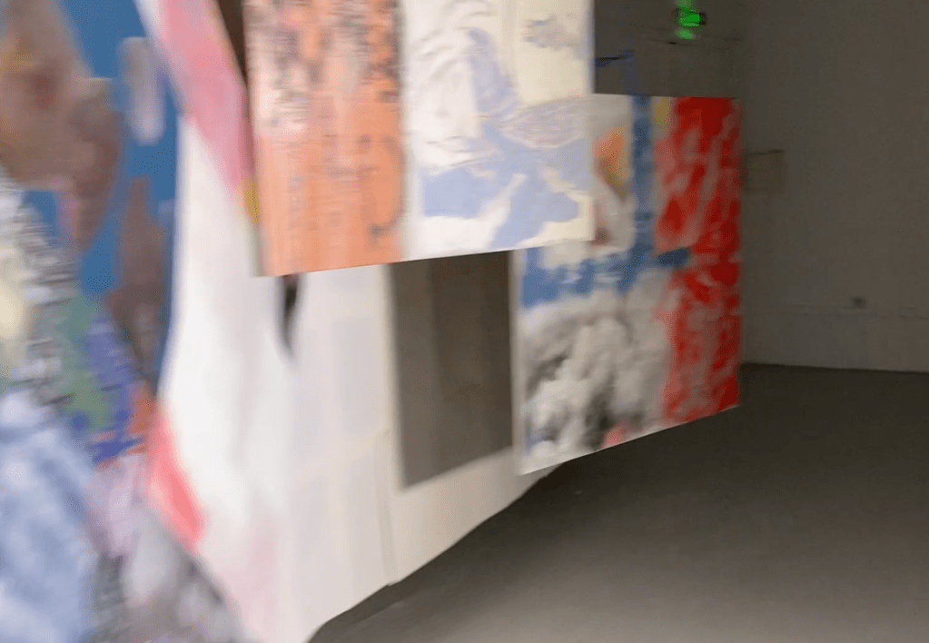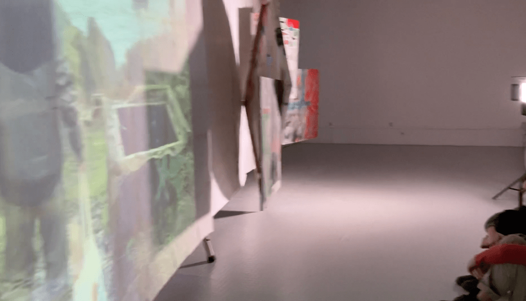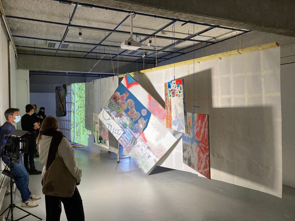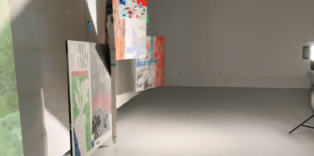 en y la ligne accrochage collectif à l'école des beaux arts de bordeaux. avec Lara Carlon (vidéos) et Victor Chavot (peintures). série voyage voyage 2021