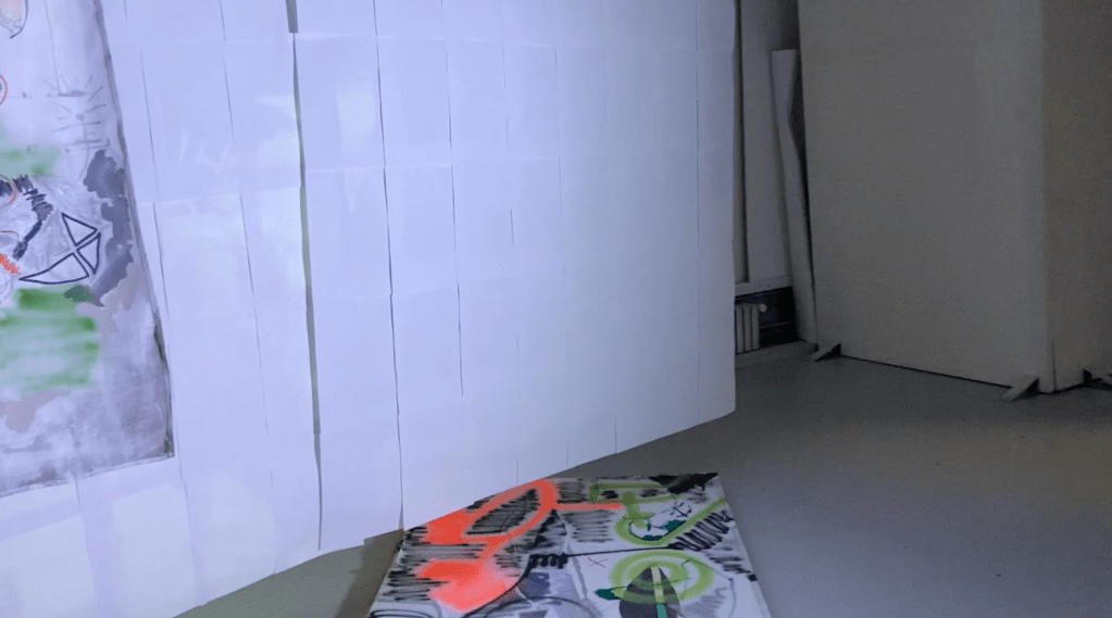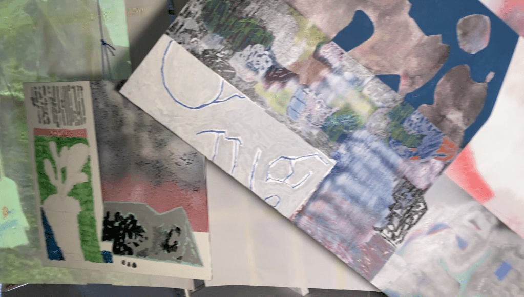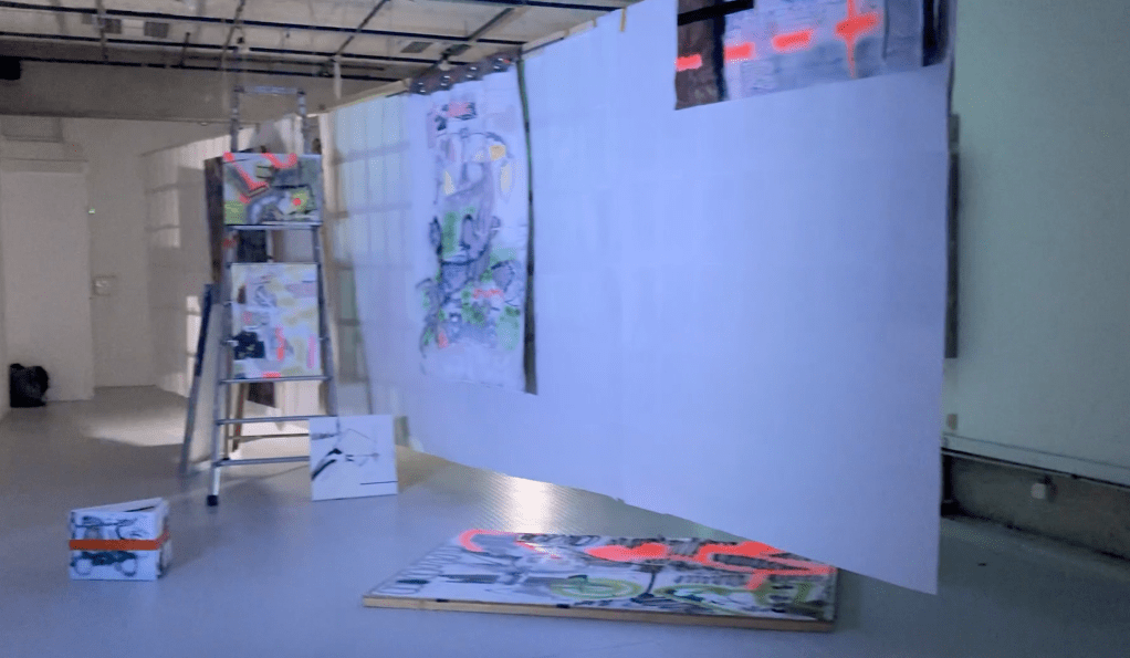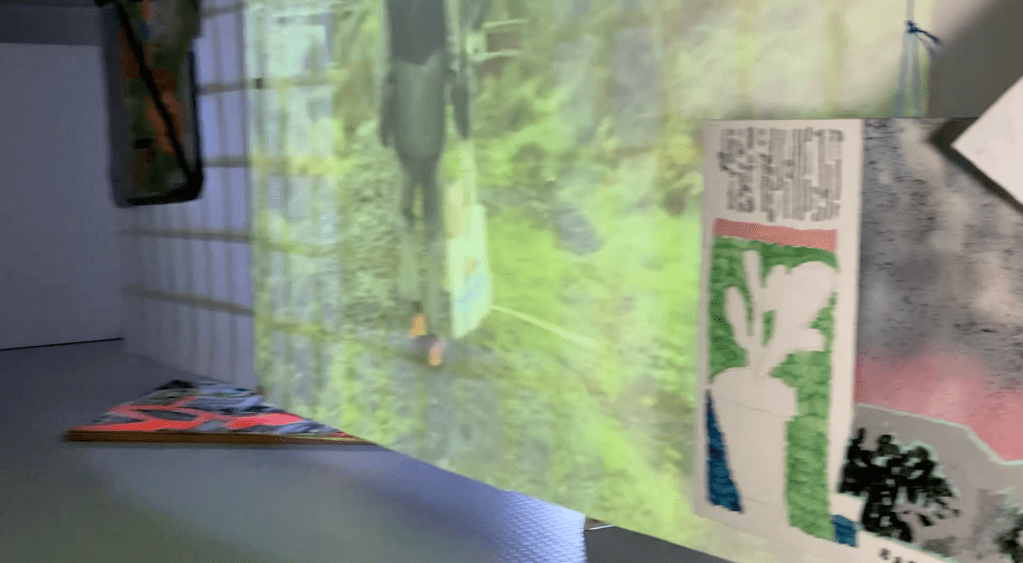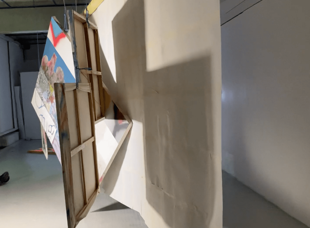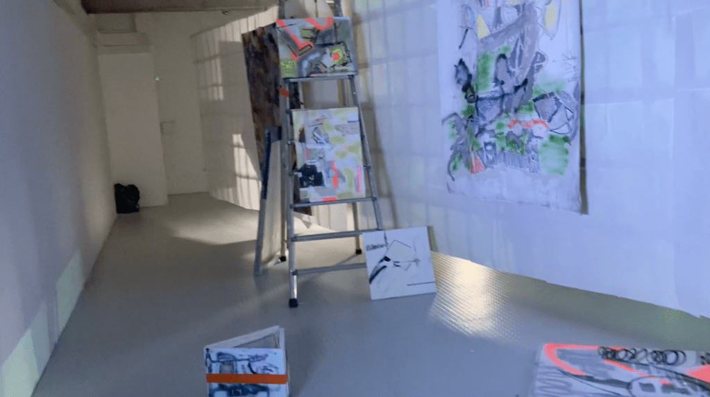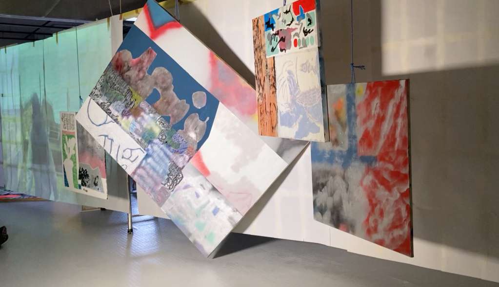 en y la ligne accrochage collectif à l'école des beaux arts de bordeaux. avec Lara Carlon (vidéos) et Victor Chavot (peintures). série voyage voyage 2021