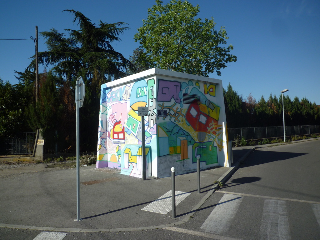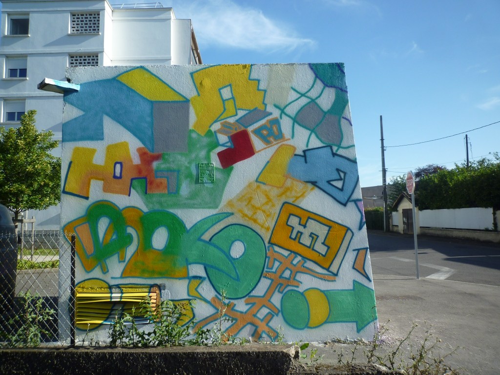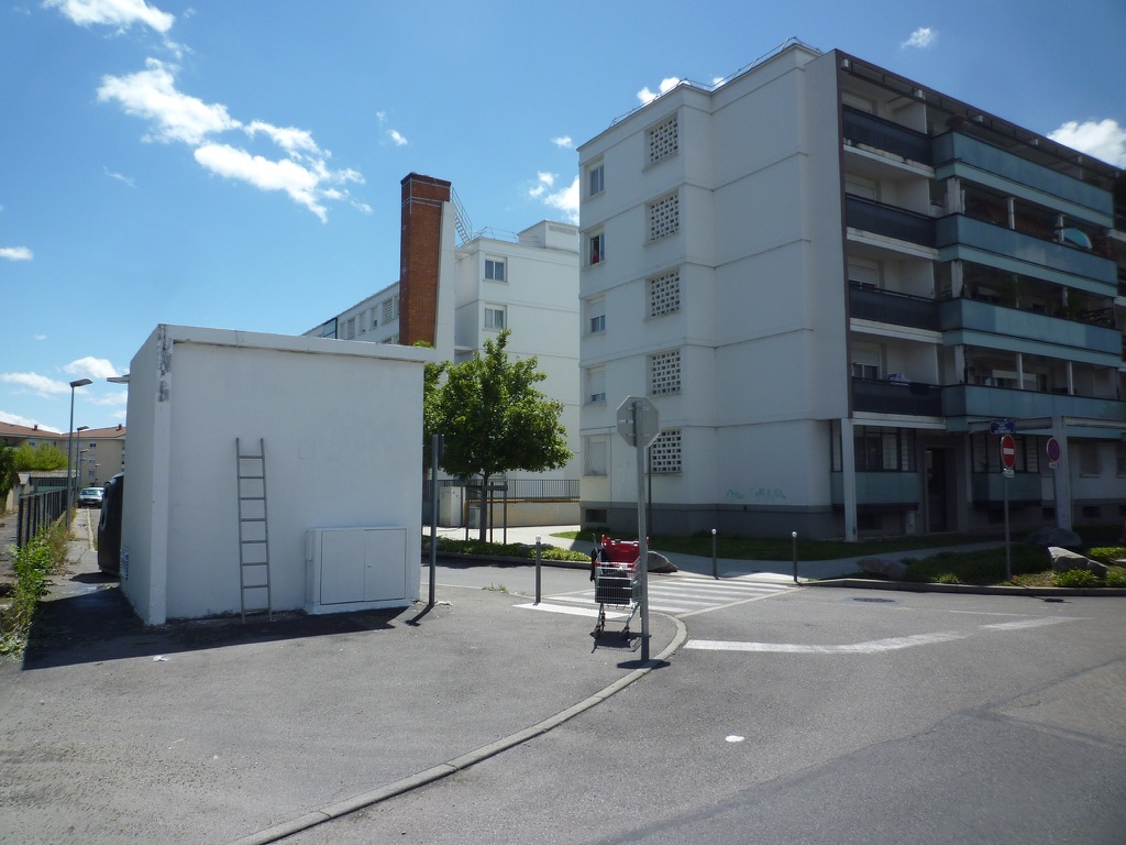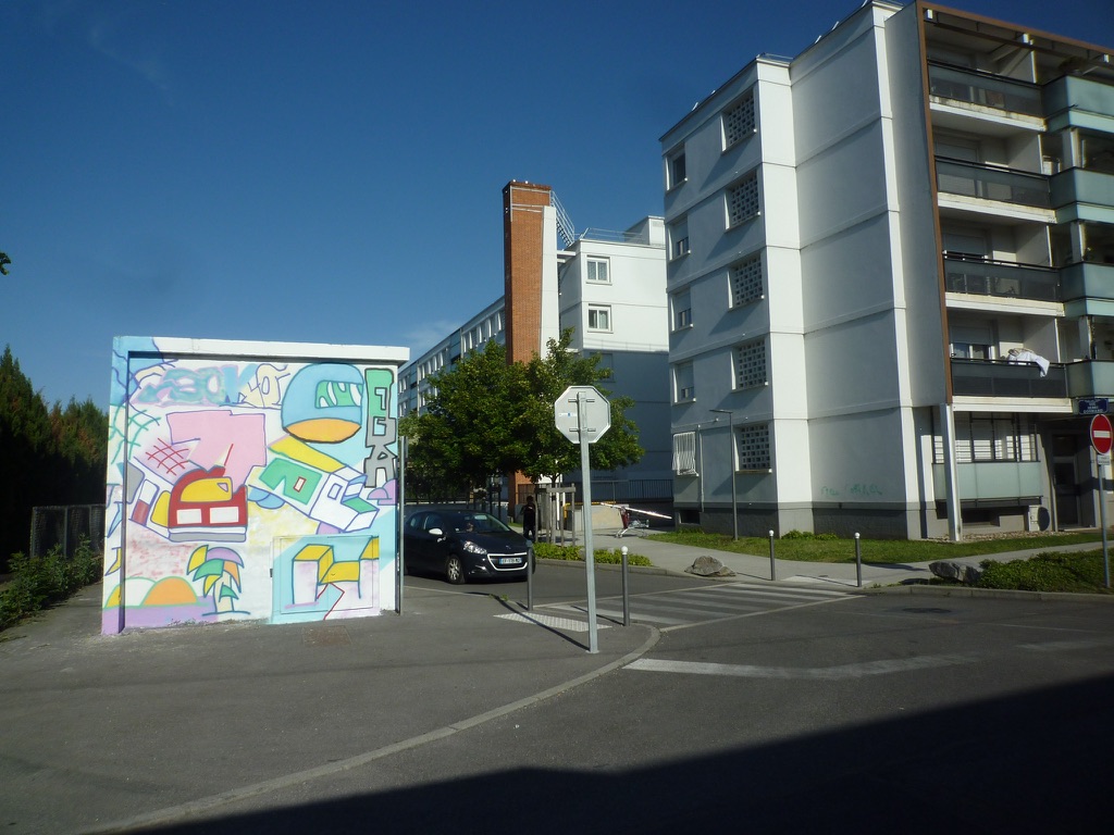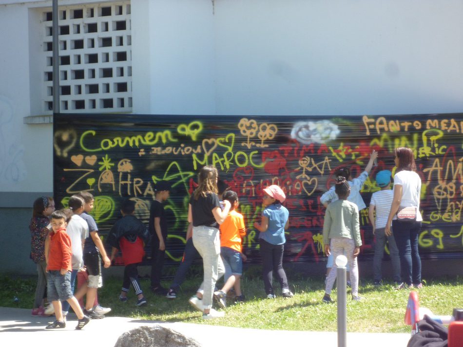 réalisation d'une fresque sur le thème du "vivre ensemble" dans le quartier de Chenier à Vaux-en-Vélin. atelier peinture avec les enfants de l'école Marie-Curie et les habitants du quartier. juin 2019